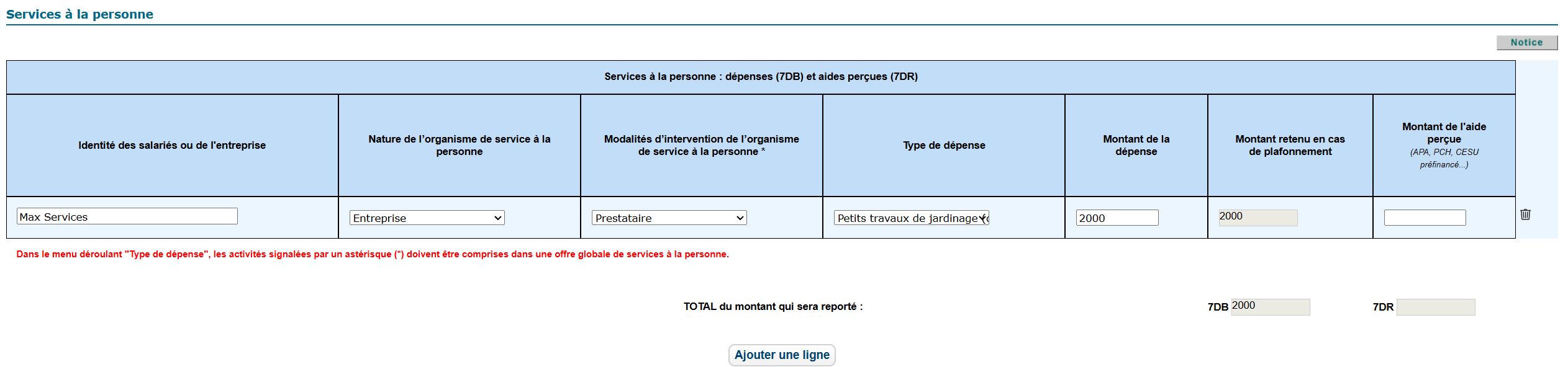 - Pour plusieurs prestations distinctes, ajoutez une ligne pour chacune.