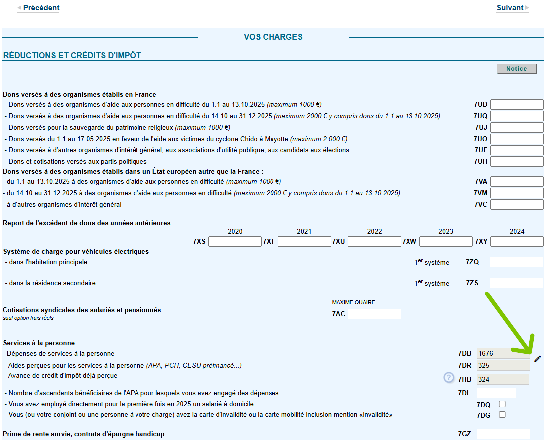 - Vous arriverez ensuite sur la page VOS CHARGES > REDUCTIONS ET CREDITS D’IMPOT